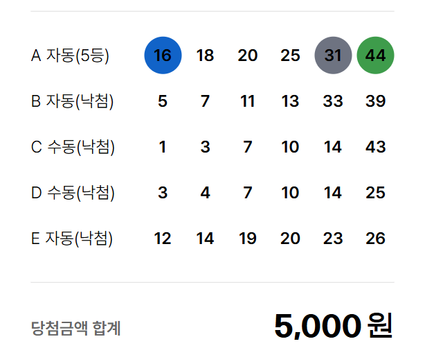 작년에 샀던 로또가 5등 당첨되어서 예치금으로 5000원이 들어와 있네요.